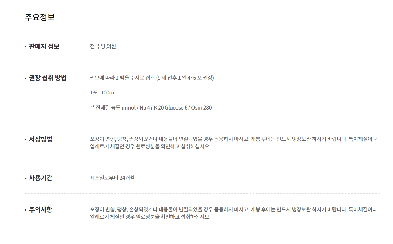 영양성분을 보시면 나트륨, 칼륨 등의 전해질과 포도당, 구연산, 비타민 등을 포함하고 있습니다.