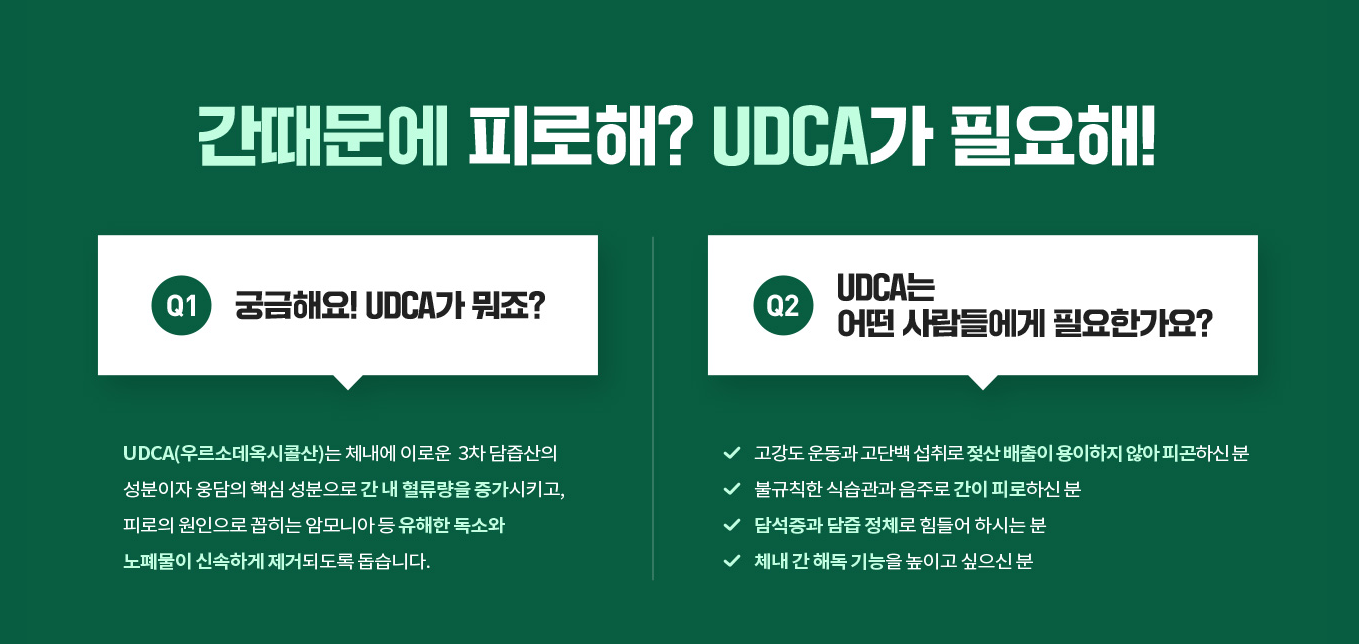 UCDA, 우루소데옥시콜산이라는 성분은 체내에 있는 '독성 담즙산'의 양을 감소시키고 '유익한 담즙산'의 양을 늘려 간세포 보호를 하는 효능을 지니고 있습니다.