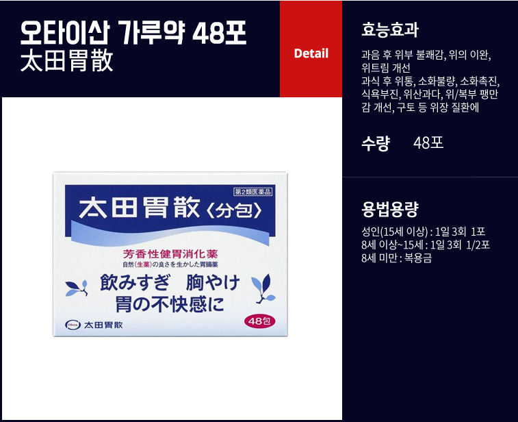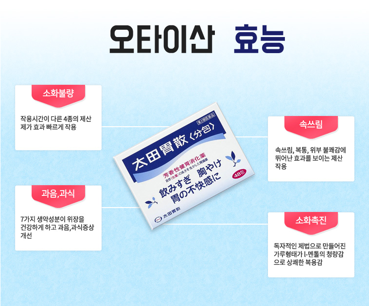 일본 쇼핑리스트라고하면 위장약으로 알려진 카베진에 대해서도 들어보셨겠지만 오타이산은 소화불량, 위부전증 증상에 있어 도움을 얻을 수 있는 소화제입니다.