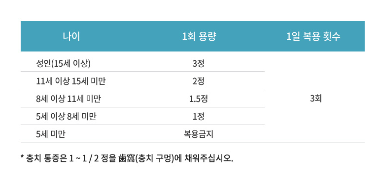 - 15세 이상 성인 : 1회 3정