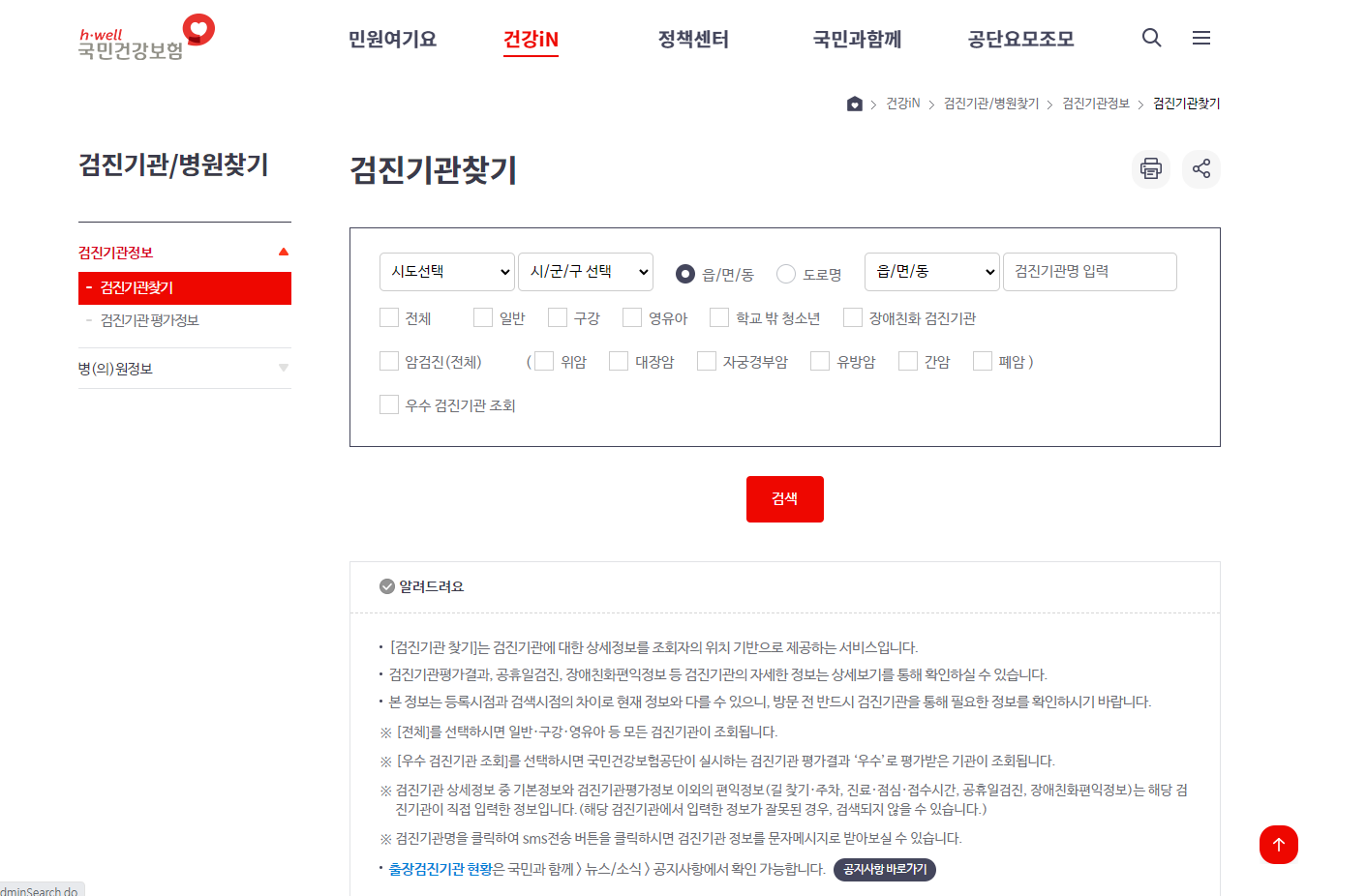 '건강IN' >> '검진기관/병원찾기' 메뉴를 클릭해주신 후 위치를 파악하시면 되겠습니다.